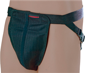 This groin protector provides protection from all brands of marking cartridges and utilizes an external strap system that permits ease of wear, comfort, and sanitary transfer between students